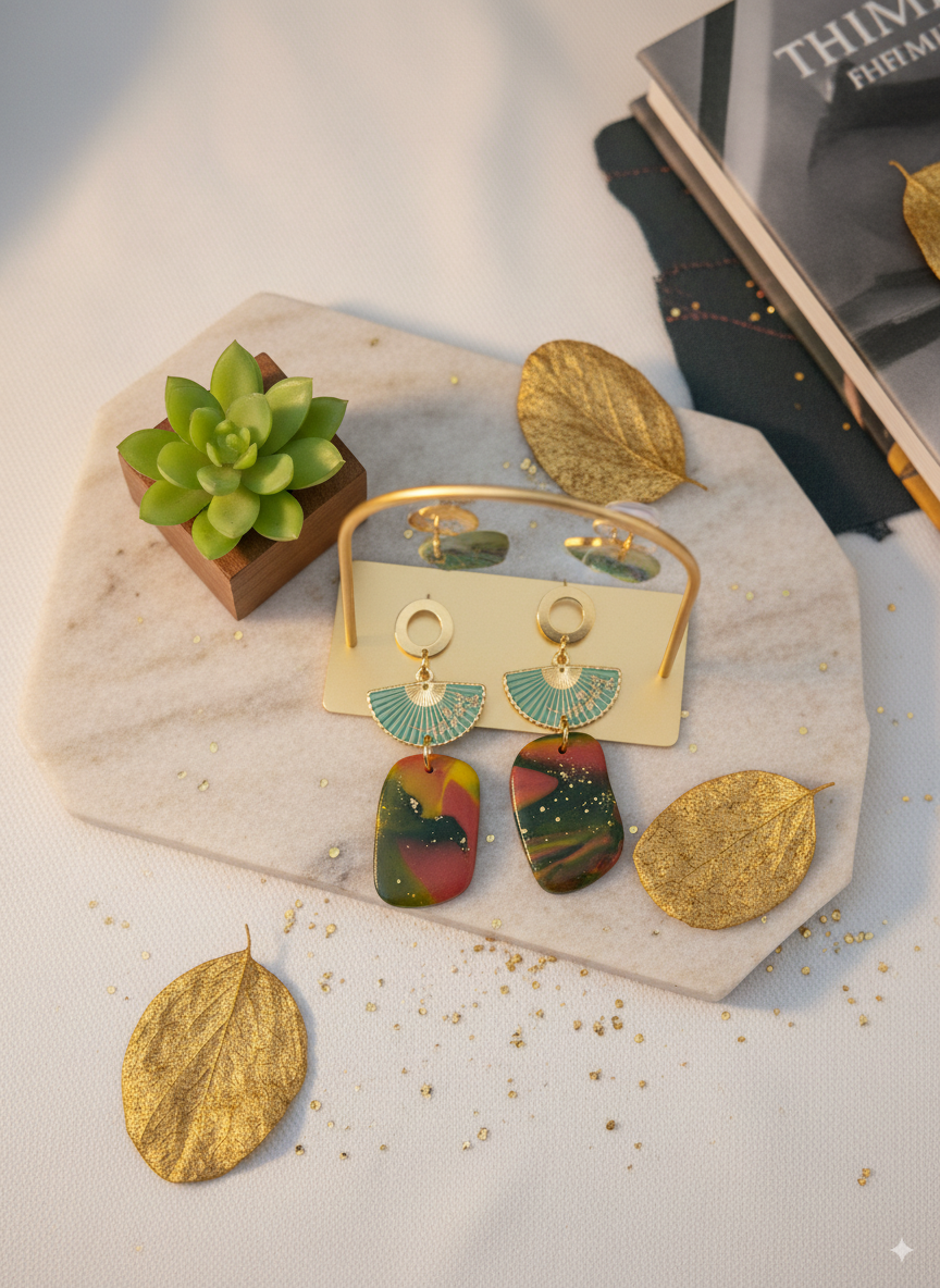 Faites main en pâte fimo aux nuances tendres de vert, jaune et rose, elles sont sublimées par un pendant éventail en alliage de zinc doré qui apporte élégance et luminosité. Leur clou d’oreille rond plaqué or 24 carats assure confort et brillance, tout en mettant en valeur le design unique.