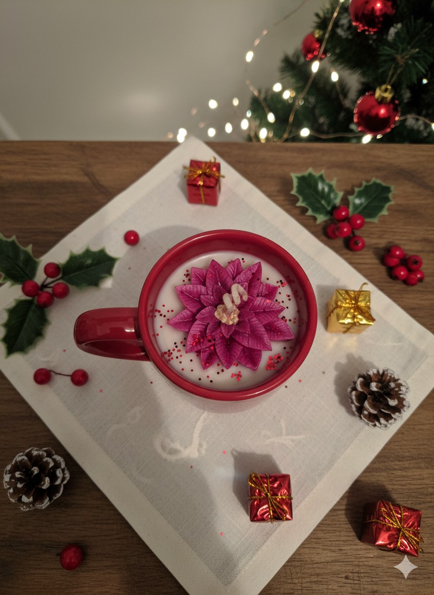 Plongez dans la magie des fêtes avec la bougie “Tasse Enchantée”, une création artisanale unique coulée dans une véritable tasse de Noël décorée.